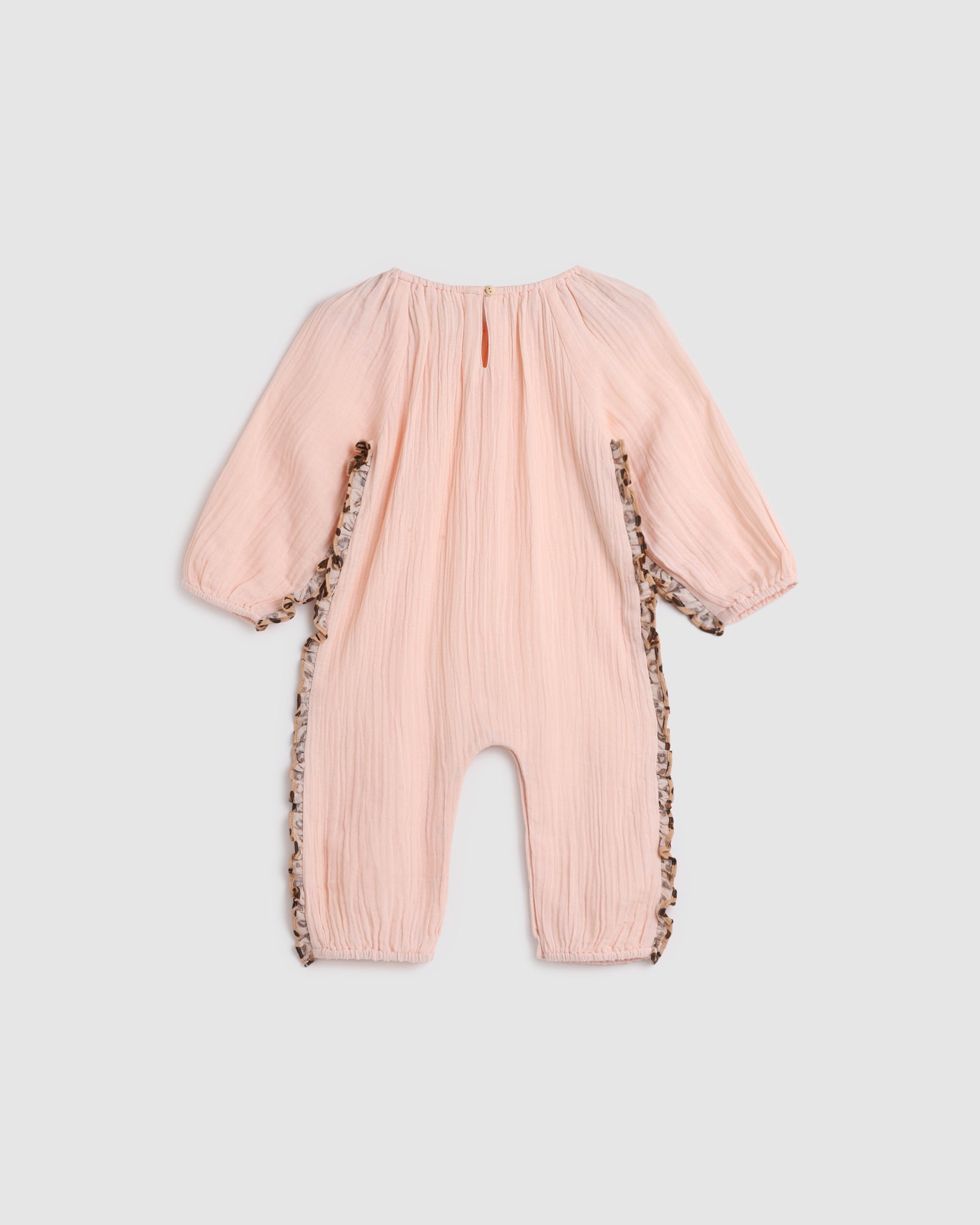 Introducing the Iris Playsuit ... Crafted from the softest cotton gauze with our gorgeous baby pink fabric and leopard pattern. The leopard frill binding adorns the entire outer playsuit, adding a touch of whimsical elegance to every movement.