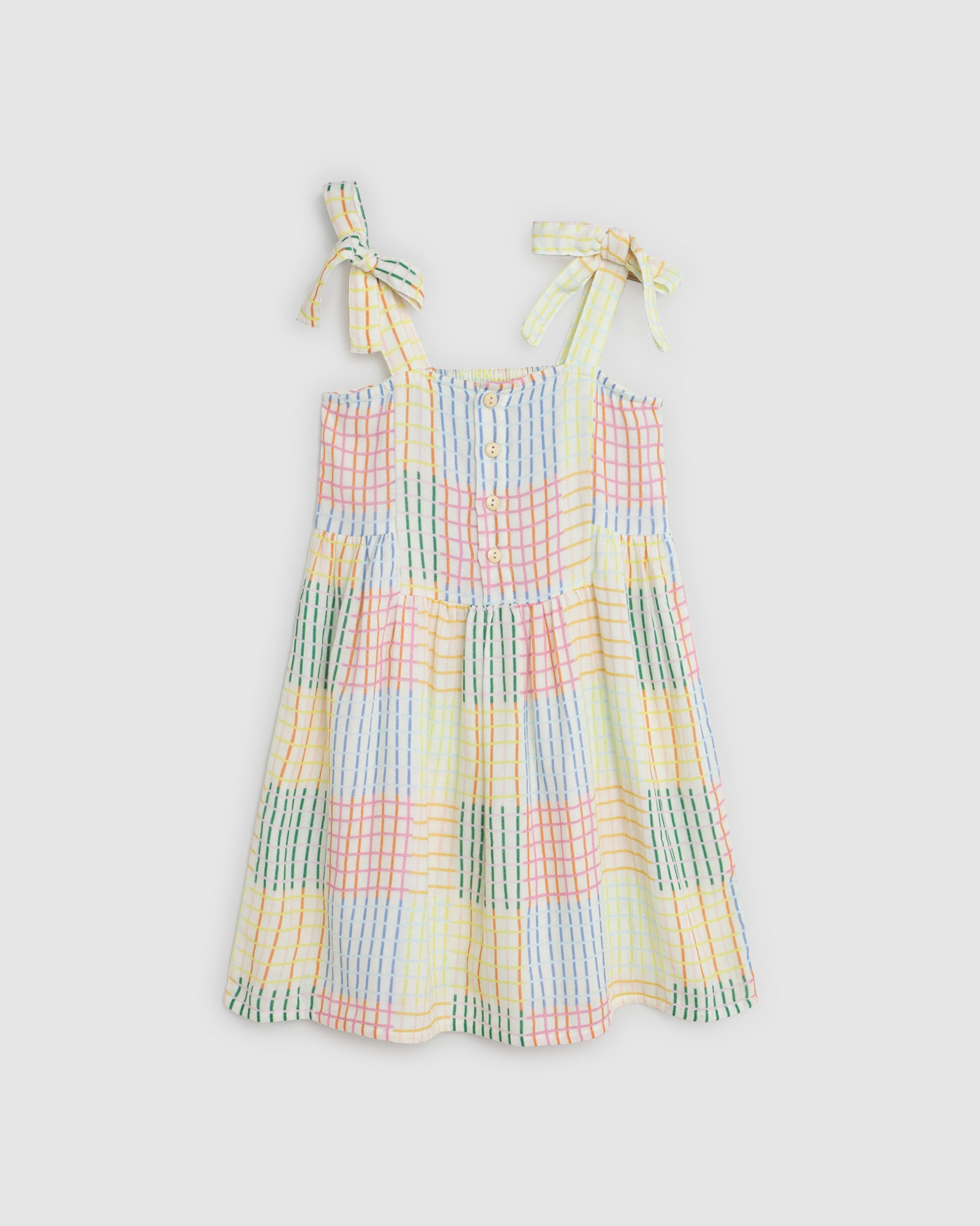 Make a bold statement with our adorable Stevie Dress in Crazy Gingham... featuring tie sleeves that add a hint of whimsy to its vibrant and fun design. A beautiful cut on the front panel, adds a fashion feel to this sun dress.
