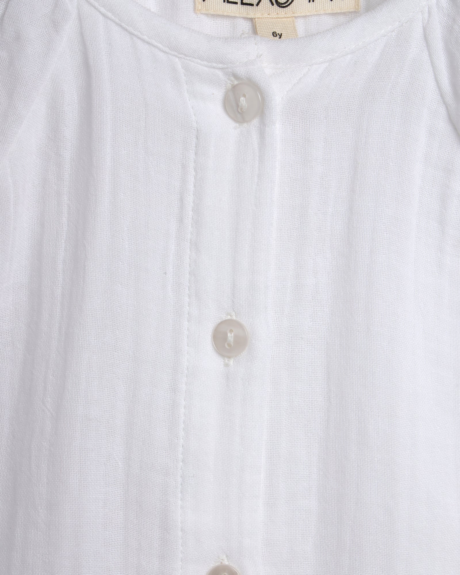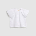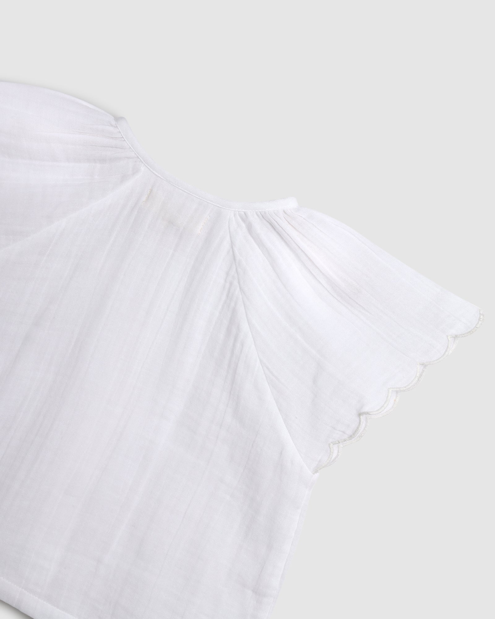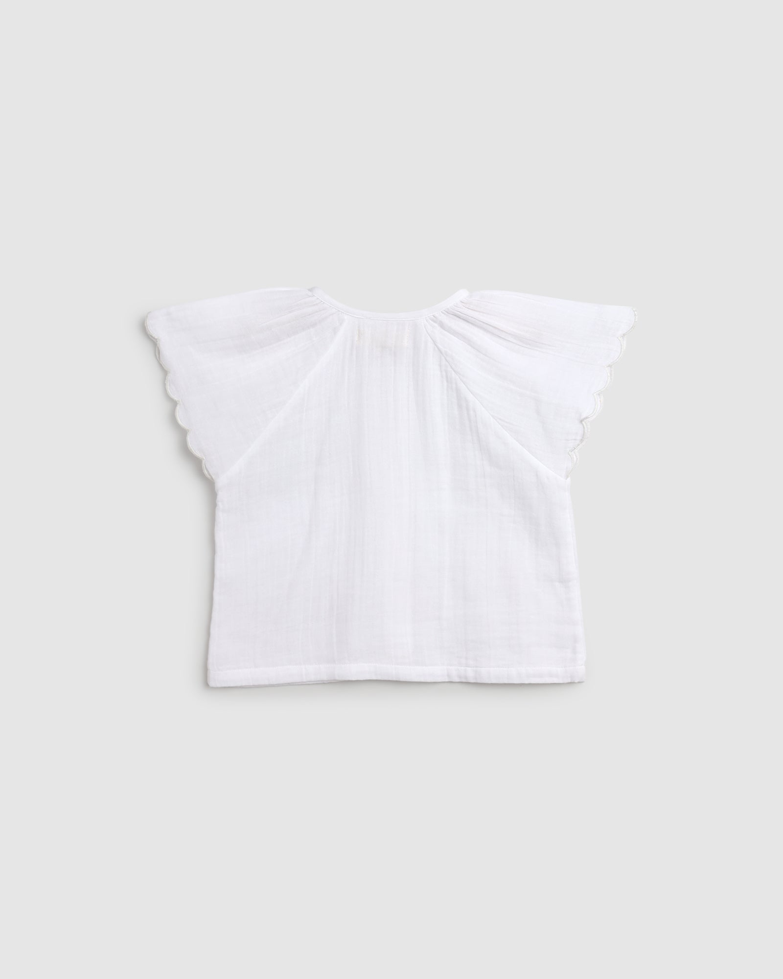 The Emmi Top in white cotton gauze is a versatile and stylish addition to your little one's wardrobe. Featuring delicate scalloped sleeves, this top is perfect for pairing with skirts, shorts, or jeans. Made from soft cotton gauzeit provides comfort and breathability for all-day wear.