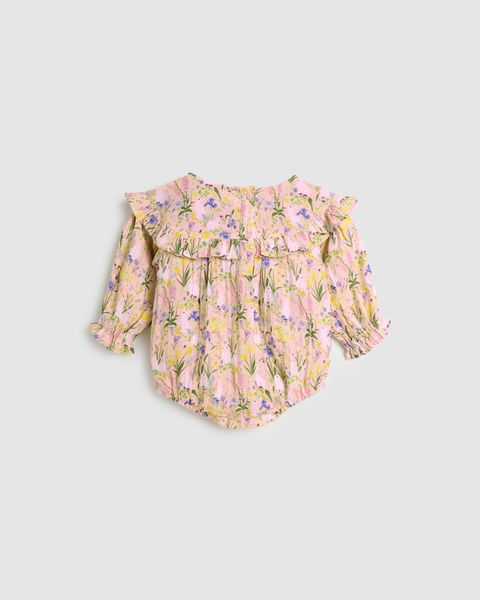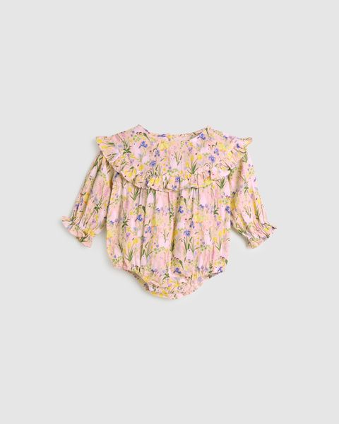 The Blossom Playsuit in Bunnies print features a gently gathered neckline and gorgeous ruffles with soft elastic at the wrists and ankles for a snug, comfortable fit. The adorable bunny fabric makes it a delightful choice for everyday wear.