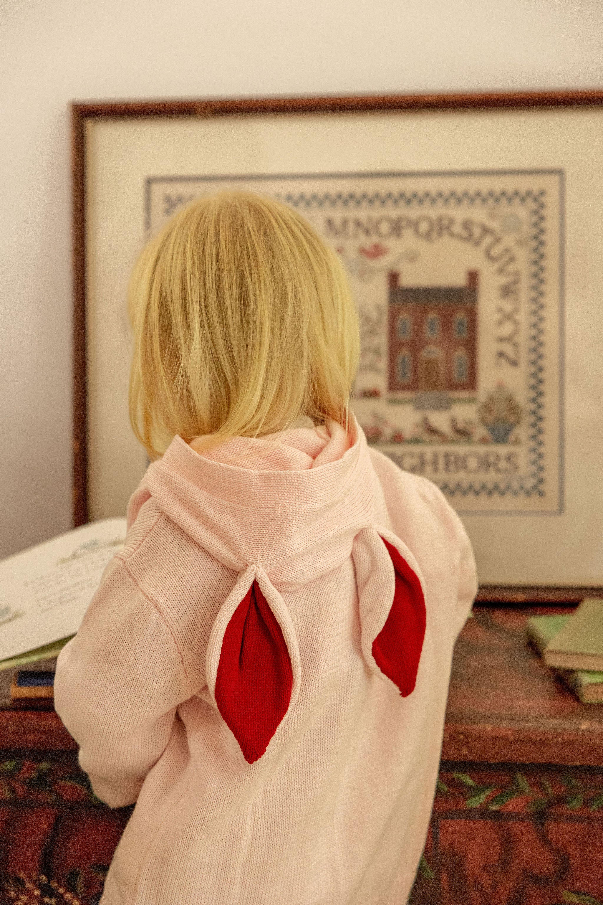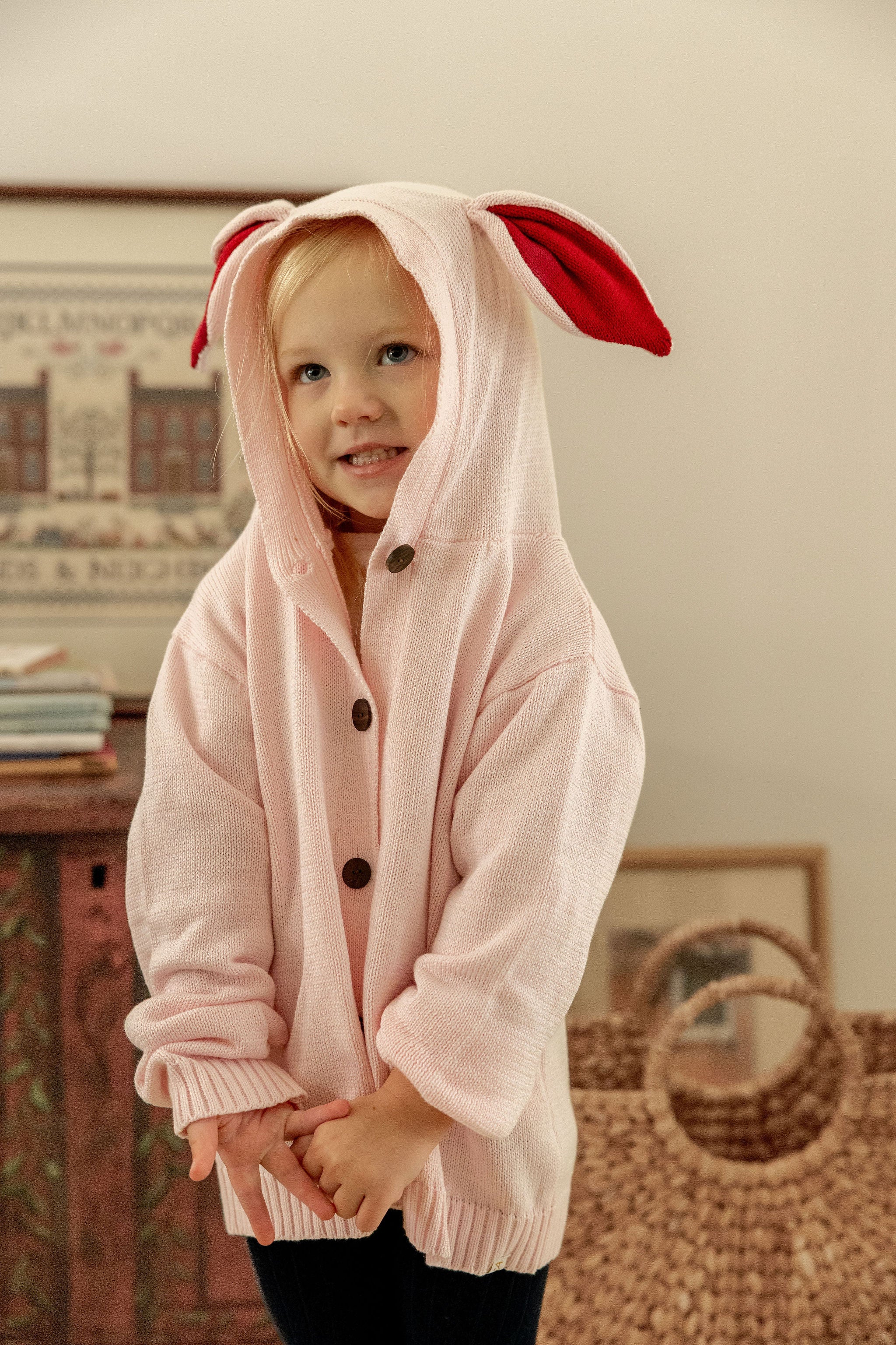 This cardigan is a dream ! With the cooler days, who wouldn't want to have a hood adorned with bunny ears ! With the ears a super fun red, this cardigan is absolutely divine. How cute for Easter !!